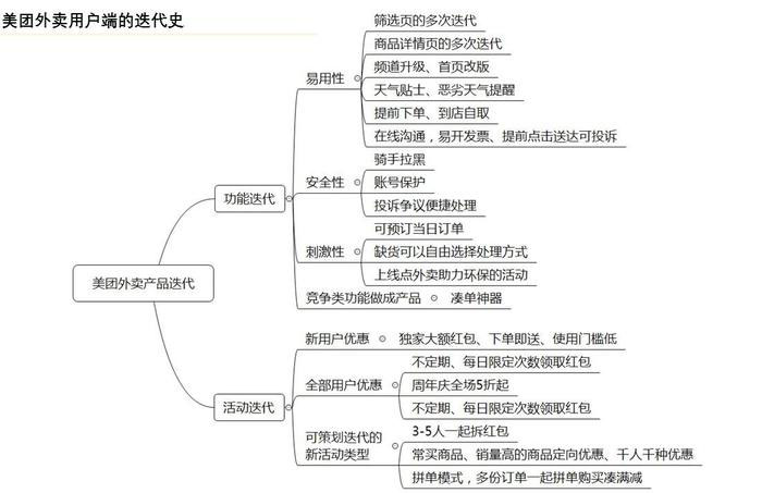 從上圖看到,美團外賣產(chǎn)品功能迭代方向主要分為兩類:功能迭代和活動迭代。功能迭代以豐富安全性、易用性功能為主,活動方面以激勵消費為主,當然美團還推出了一些創(chuàng)新功能:智能助理和滿減神器,這兩個功能可以說是比較新穎的,足見美團在功能方面的投入。